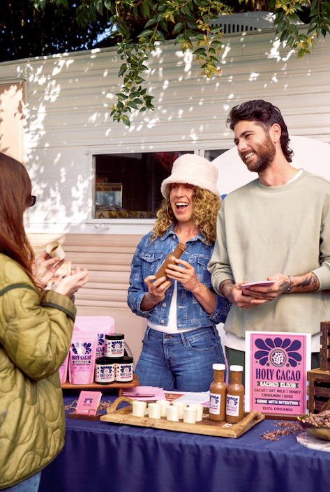 Our home and studio became a gathering place for connection, yoga, and cacao. So when we arrived in Venice, it felt natural to keep sharing. We started serving cacao to new friends, and soon found ourselves at the Mar Vista Farmers Market, energized by the buzz of local vendors and community spirit.